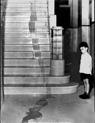 mirando la sangre que ha dejado Juan Pedro Carbó Servia en la escalera